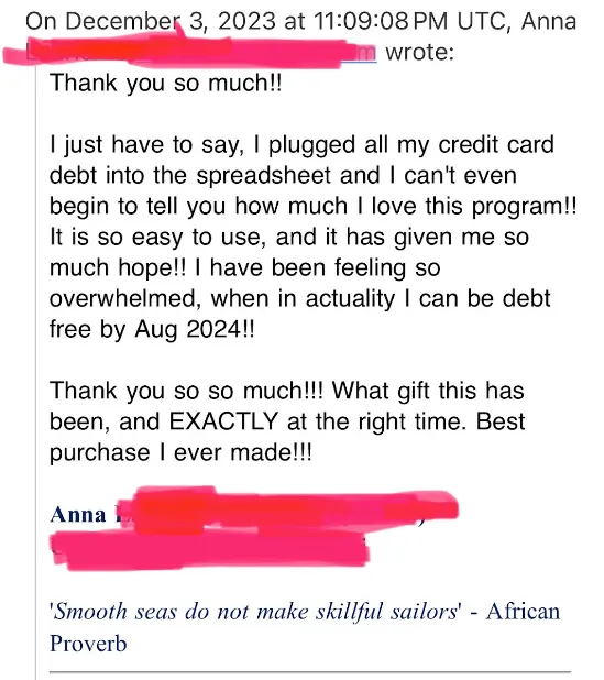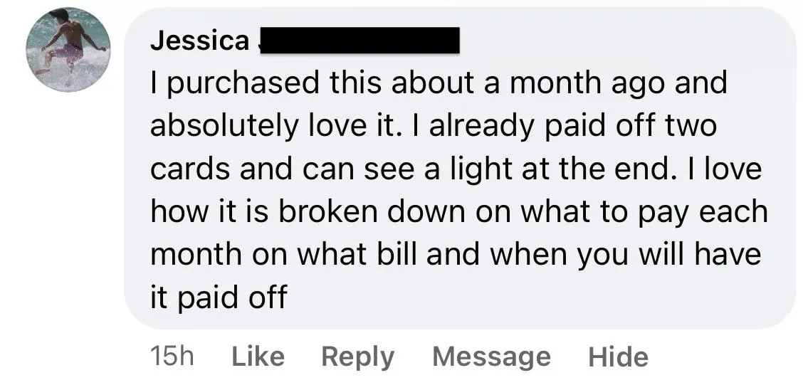 I know this program sounds too good to be true. And to be totally transparent with you: I hope that it IS too good to be true. I want it to be an INSANE value to you so that after you dig in, gain some traction, feel the hope of your situation, and see that you can LIVE while you're paying off debt you'll come back and buy some of my other products that'll help you with other areas of your finances. 🙌
