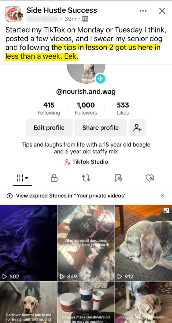 While I (obviously) can't promise that you'll hit $100,000 months immediately (you'll need more advanced strategies like paid advertising to reach those higher numbers), the Side Hustle Success program will equip you with everything you need to make your first $500-$1,000 super quickly and then scale up to at least $3,000 monthly.